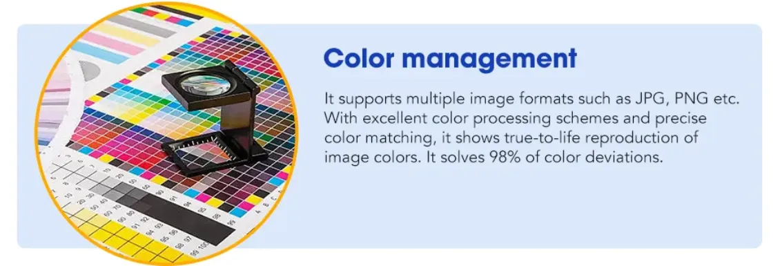 It supports multiple image formats such as JPG, PNG etc, With excellent color processing schemes and precise color matching, it shows true-to life reproduction of image colors. It solves 98% of color deviations.