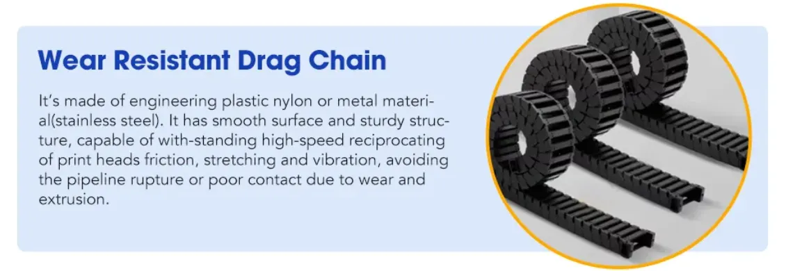 It's made of engineering plastic nylon or metal material(stainless steel). It has smooth surface and sturday structure, capable of with-standing high-speed reciprocating of print heads friction, stretching and vibration, avoiding the pipe line rupture or poor contact due to wear and extrusion.