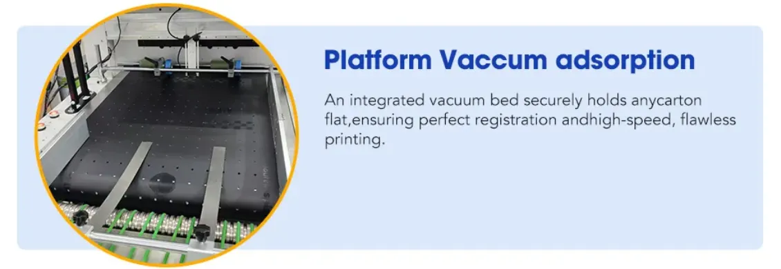 An integrated vacuum bed securely holds any carton flat, ensuring perfect registration and high-speed , flawless printing