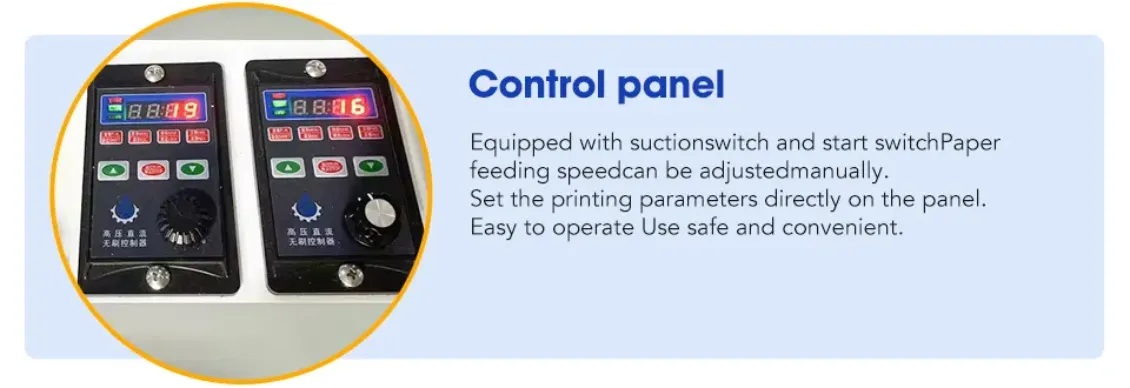 Equipped with suction switch and start switch, paper feeding speed can be adjusted manually.