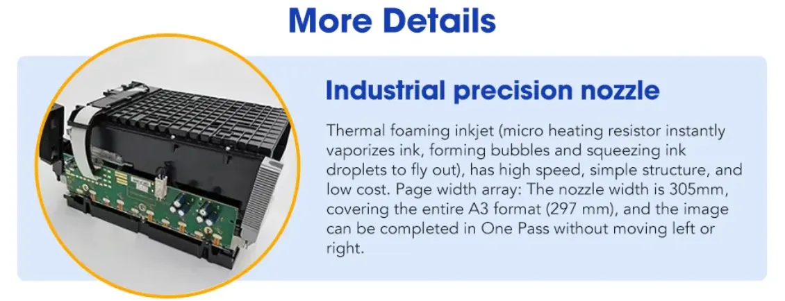 Thermal foaming inkjet(micro heating resistor instantly vaporizes ink, forming bubbles and squeezing ink droplets to fly out) , has high speed, simple structure, and low cost. Page width array: the nozzle width is 305 mm, covering the entire A3 format(297 mm), and the image can be completed in one pass without moving left or right