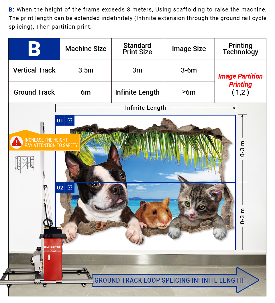 | A. When the height of the image is within 3 meters,the print length can be extended indefinitely(infinite extension through the ground rail cycle splicing), the printer does not require partition printing, create the perfect picture at once. | B. When you need to print images over 3 meters,using scaffolding to raise the machine, the print length can be extended indefinitely(infinite extension through the ground rail cycle splicing) , then partition print. |