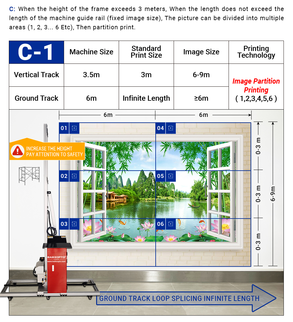 | C. When the height of the frame exceeds 3 meters , when the length does not exceed the length of the machine guide rail (fixed image size), the picture can be divided into multiple areas(1,2,3....6 etc.) ,then partition print. | D. When the height of the frame exceed 6 meters , when the length exceeds the length of machine rail(guide rail can be cyclically spliced to achieve image length), When you need to print different partitions, the picture can be divided into multiple areas(1,2,3...6 etc.), then partition print. |