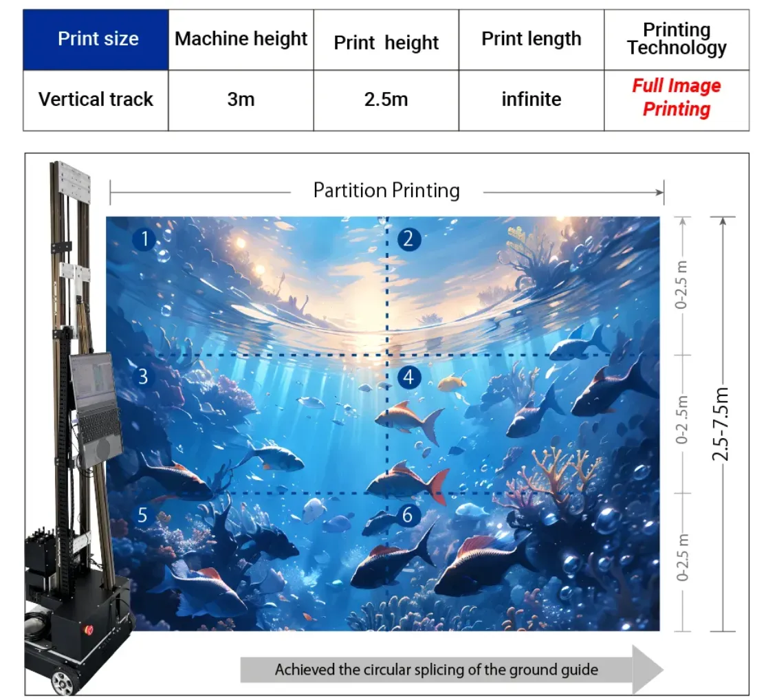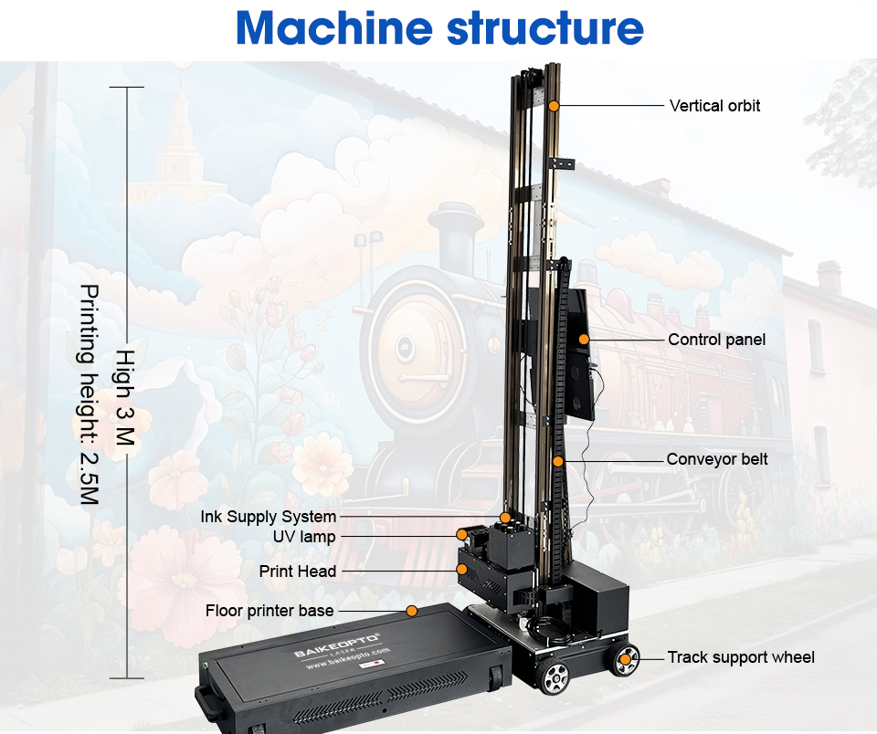 1. Removable structure, facilitating quick assembly/dismantling; after disassembly,the volume is small, suitable for outdoor wall paintings, floor decorations andmobile on-site operations. 2. Vertical printing: maximum single printing height is 2.5 meters, with no limit onlength. Suitable for indoor wall art and commercial building exterior advertisements. 3. Horizontal printing: maximum single printing width is 2.5 meters, with no limit onlength, suitable for indoor and outdoor floors, parking lot marking. 4. Special mobile platform for horizontal printing: stable operation, high-definitionoutput. |