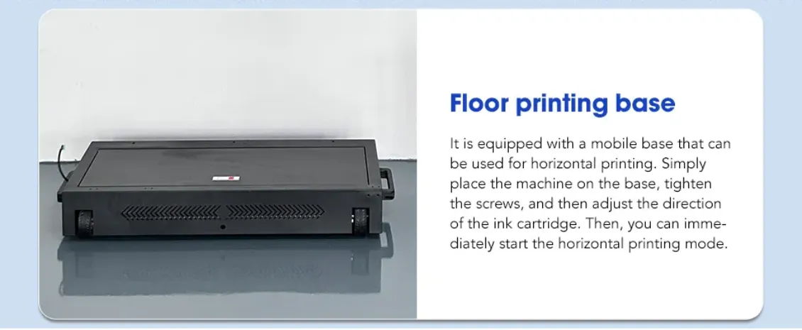 Floor printing base It is equipped with a mobile base that can be used for horizontal printing. Simply place the machine on the base, tighten the screws, and then adjust the direction of the ink cartridge. Then, you can immediately start the horizontal printing mode. |