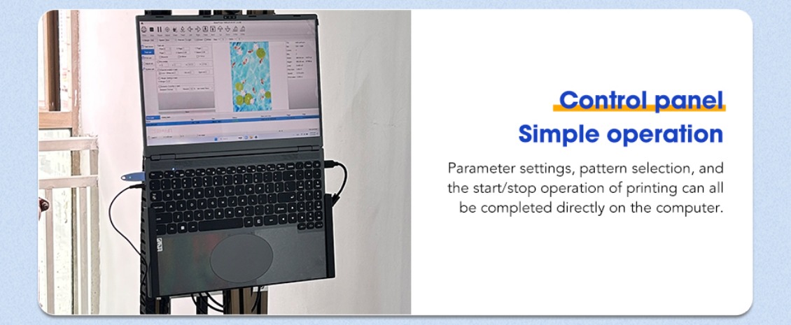 Parameter settings, pattern selection, and the start/stop operation of printing can all be completed directly on the computer. |