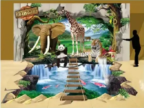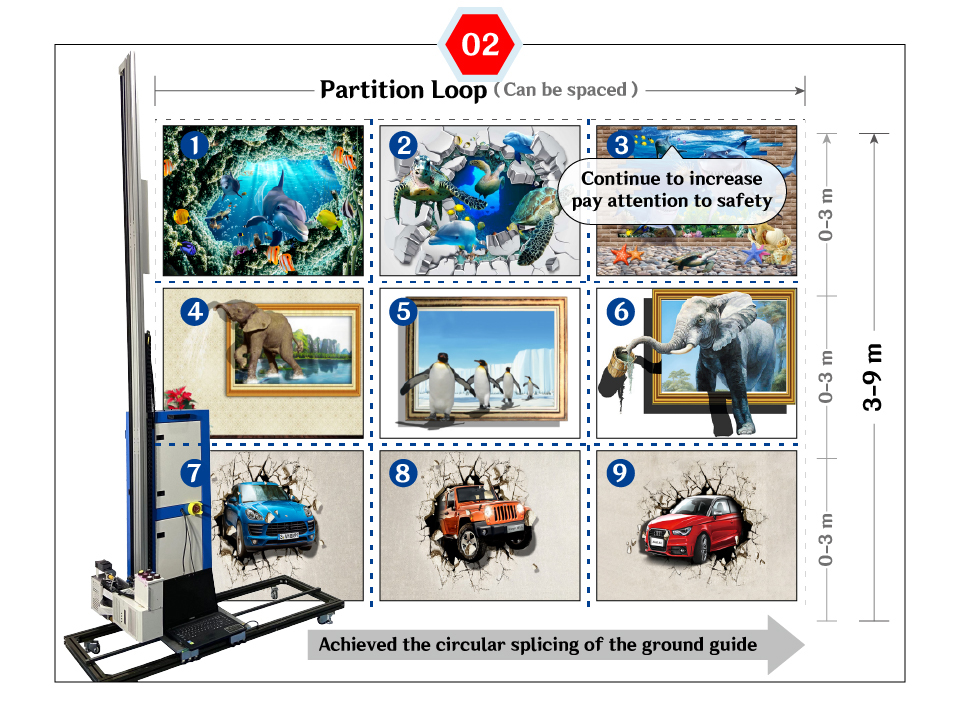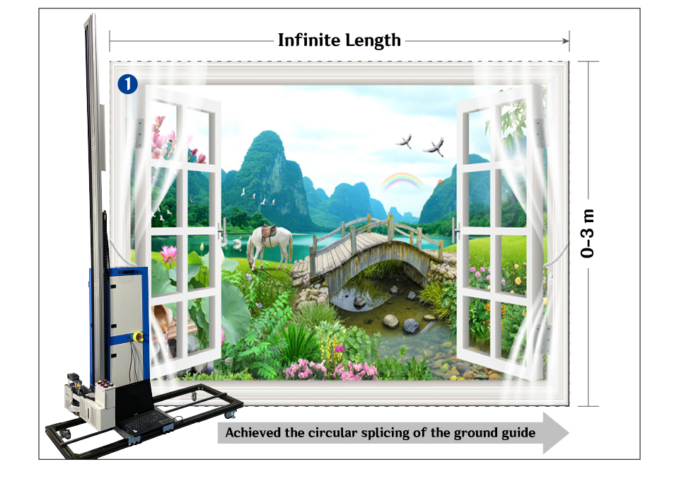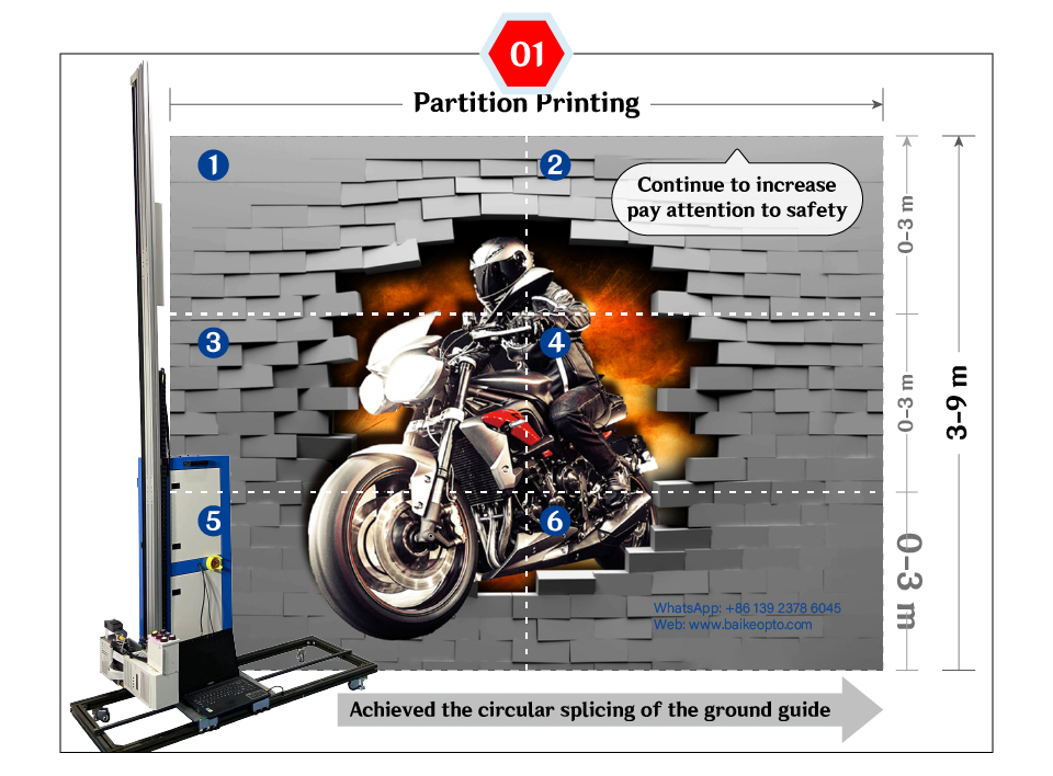 | A. When the height of the image is within 2.5 meters,No Partitioning required, one print done. | B. When you need to print images over 2.5 meters,the machine can to be raised by the scaffold for partition printing. |