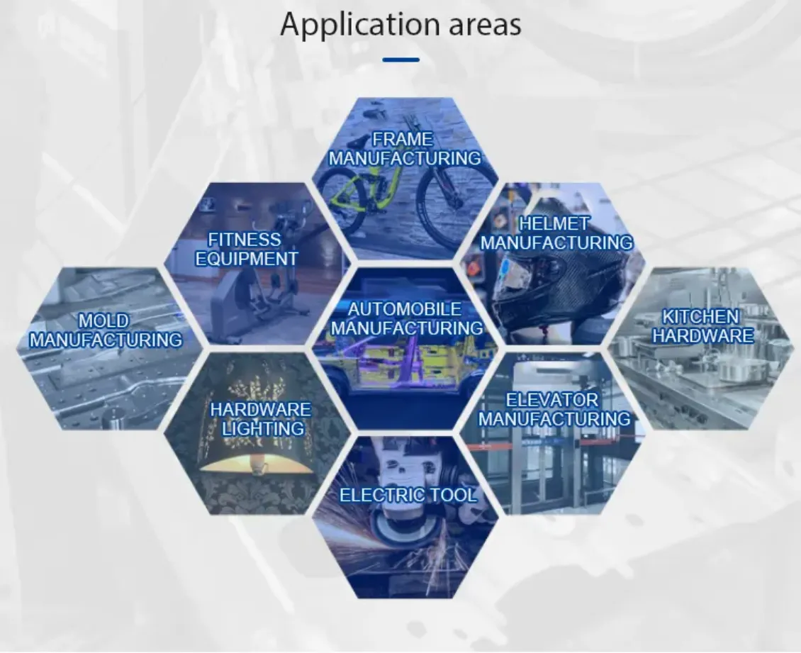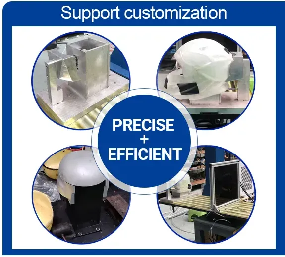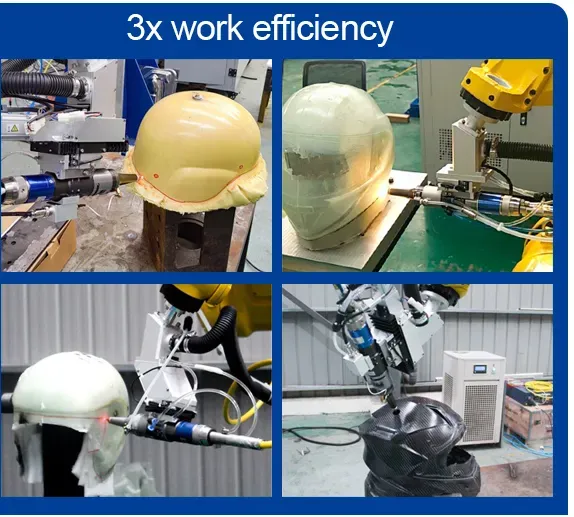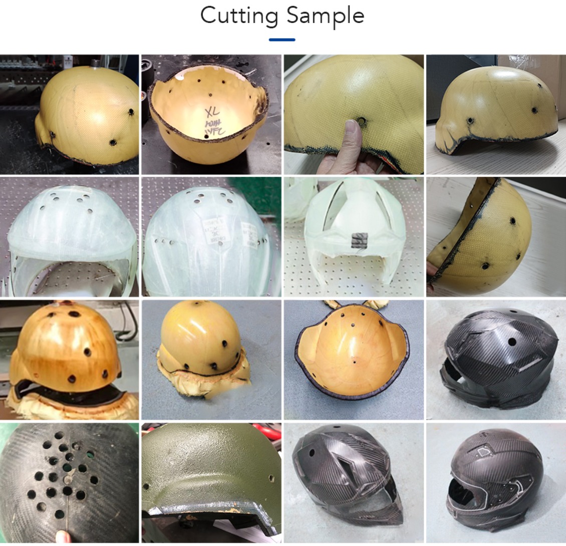 3. lt is applicable to different products and different trajectories, especially suitable for the irregular processing of three-dimensional parts. Therefore, it is widely used in helmet cutting, die-casting and forming tools, and can easily achieve hole cutting and edge cutting of helmets made of materials such as glass fiber, carbon fiber and Kevlar