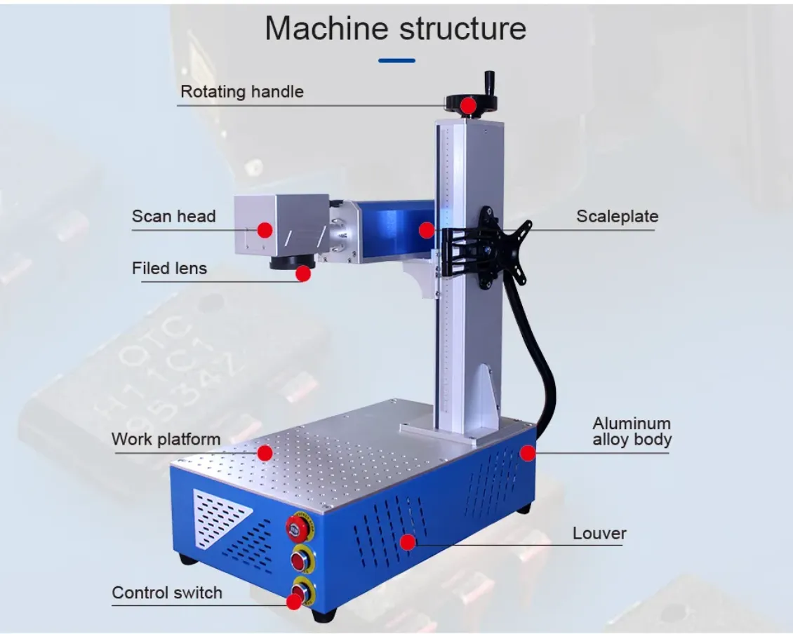 1.Portable design, compact and lightweight, suitable for on-site marking (such ason-site maintenance marking of large equipment). 2. High-precision marking, suitable for fine micro-marking (such as micro electronic components). 3. The marking efficiency is fast and it is suitable for mass production. 4. Low energy consumption: Fiber lasers do not require complex cooling systems 5. Crafted with high-quality components, it features long-lasting performance and simple maintenance. 6. Wide material adaptability: lt can mark metals, non-metals (such as plastics, ceramics), composite materials,etc. 7.Intuitive touchscreen interface and user-friendly software. |