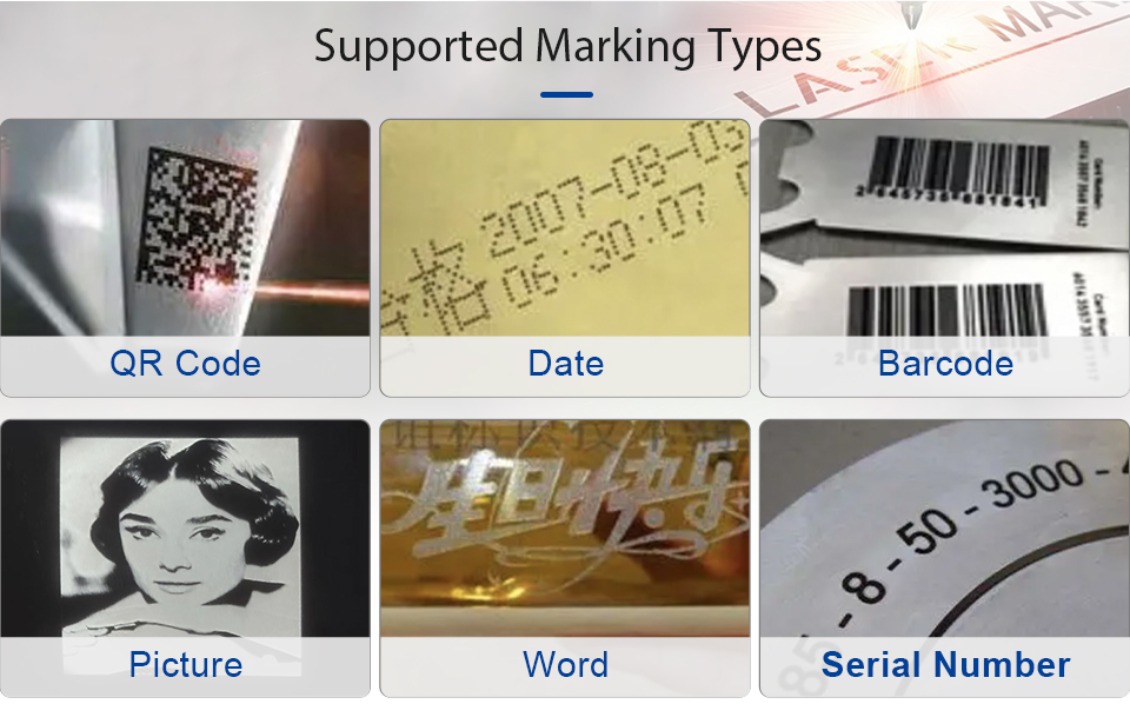 Marking Type: QR code, barcode, Chinese, English, date, logo, pattern, etc. 1.Can be a variety of metal, non-metallic materials processing. lt is especially advan-tageous to label materials with high hardness, high melting point and brittleness. |