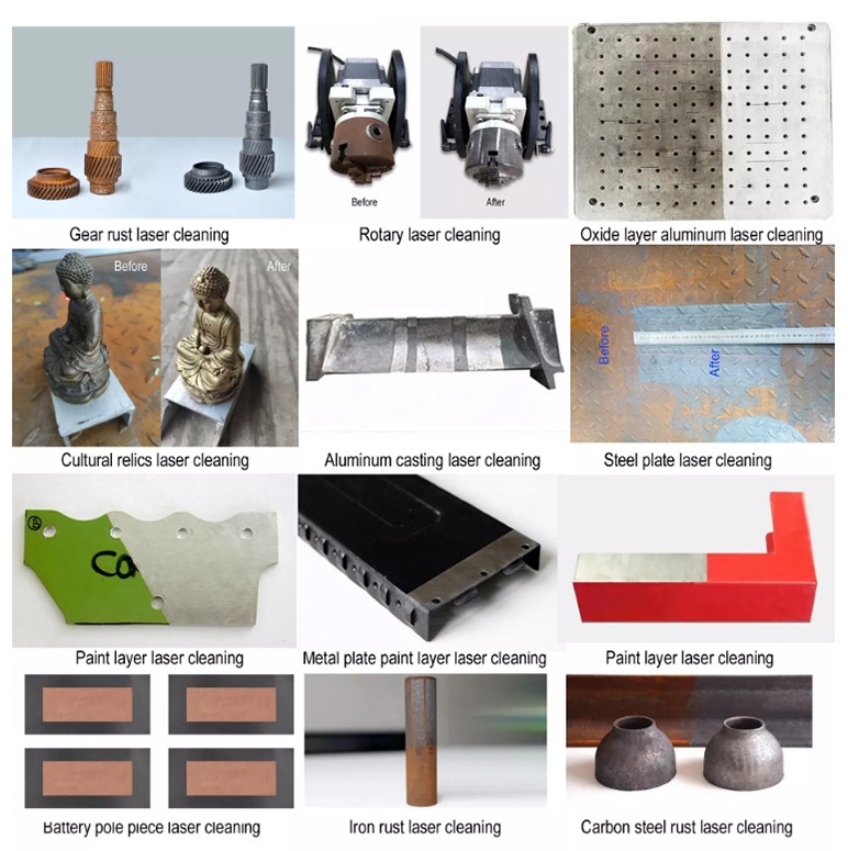 Remove surface resin, paint, oil stains, dirt, rust, coatings, and oxidation layers from objects; this process is widely used in industries such as ship building, auto repair, rubber molding, high-end machine tools, rail tracks, and environmental protection. Fiber laser cleaning machines are versatile tools used across industries for precise, non-contact surface cleaning. Common applications include removing rust, coatings, or contaminants from metal parts in industrial manufacturing, cleaning delicate electronic components like circuit boards, and restoring historical artifacts without damaging surfaces. They are also employed in automotive repair (e.g., engine degreasing), mold maintenance, and pre-treatment of materials before welding or painting. Compatible materials range from metals (steel, aluminum, copper) and plastics to glass, ceramics, and even sensitive substrates like stone or wood. The technology ensures zero surface abrasion, making it ideal for precision tasks in sectors like aerospace, medical device sterilization, and food equipment hygiene. Its eco-friendly operation eliminates the need for chemical solvents, offering a sustainable alternative to traditional cleaning methods. |