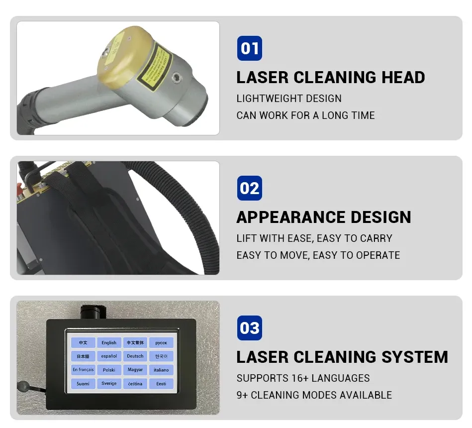 The pulse laser cleaner is lightweight (less than 10KG) , backpack and easy to carry. It's easy to carry on the back and move free. With the cleaning head hold by hand, it is especially suitable for scenarios that cannot be covered by traditional cleaning equipment, such as high altitude and small spaces surface cleaning. |