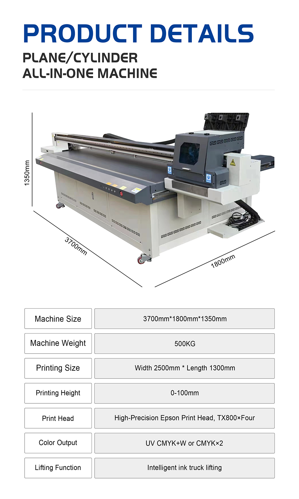 | 1. Four pcs TX800 High Precision Print Head, CMYKW UV ink 2.Waterproof,anti-corrosion,anti-scratch and anti-wear. 3.High resolution printing - provides excellent printing quality, making image details clearer and suitable for printing high demand graphics and photos. 4.Rapid curing technology - using LED UV curable ink to achieve a fast production process of instant printing and drying. 5.Environmental Protection and Energy Conservation - The low energy consumption operation process reduces environmental impact while lowering long-term operating costs. 6.Multi material compatibility - can print on various materials such as glass, metal, wood, plastic, etc. without the need for device replacement.Personalized 7.Customization capability - easily achieve personalized printing needs for small batches or a minimum order, meeting the customization market. 8.Accurate Color Management - The advanced color management system ensures that every printed color maintains consistency and accuracy. 9.White ink stacking function - can print three-dimensional and relief effects, increasing the added value and visual appeal of the product. 10. No plate making cost required - direct digital printing saves time and cost of plate making and proofing in traditional printing. |