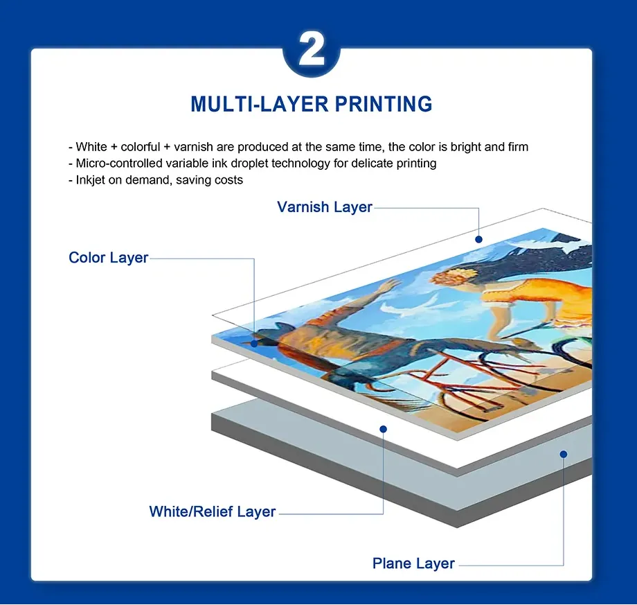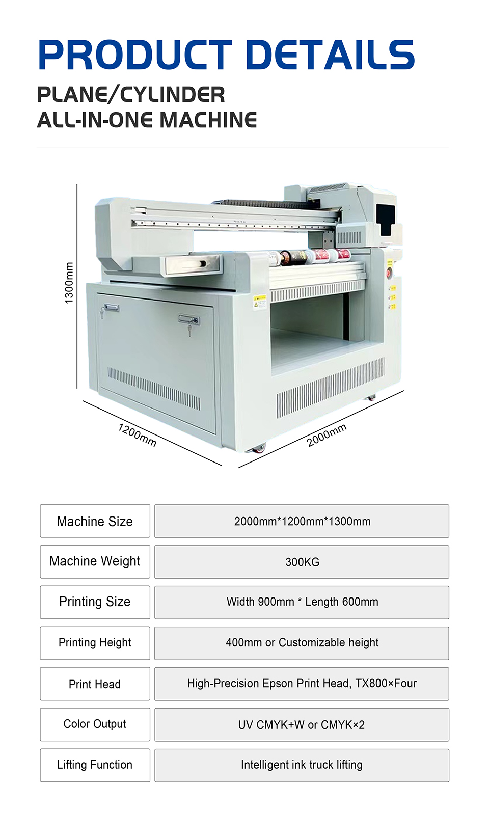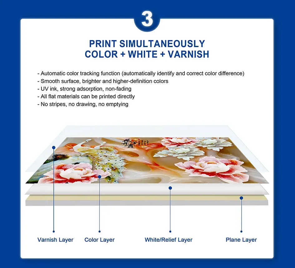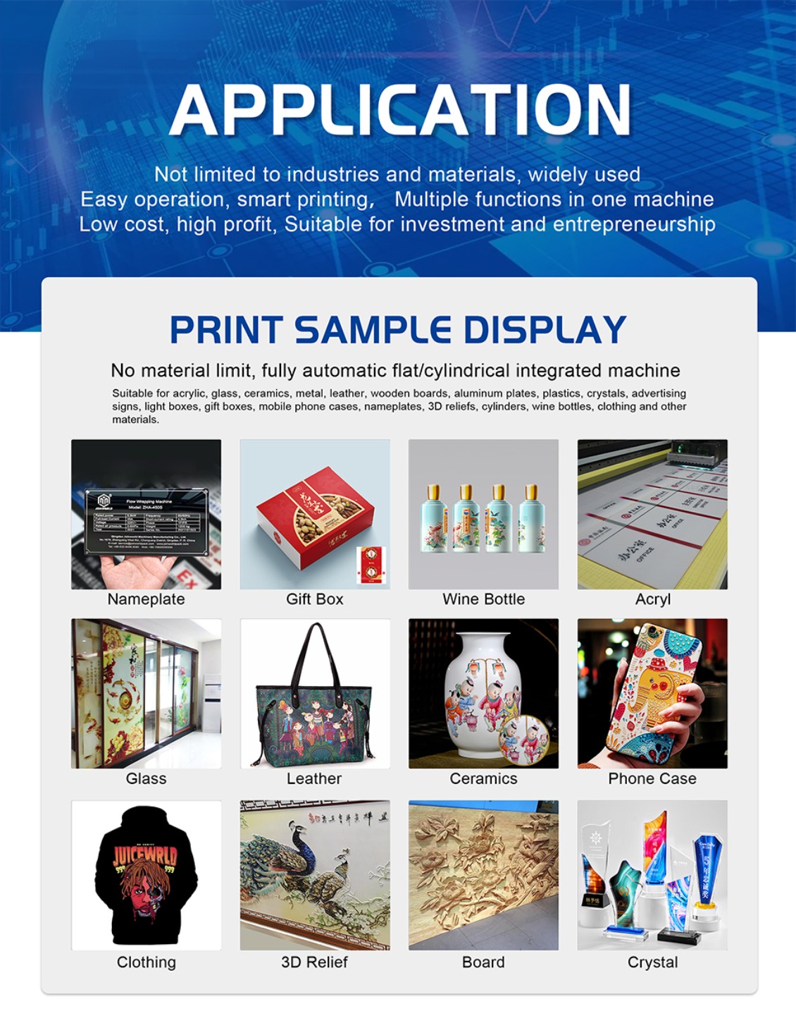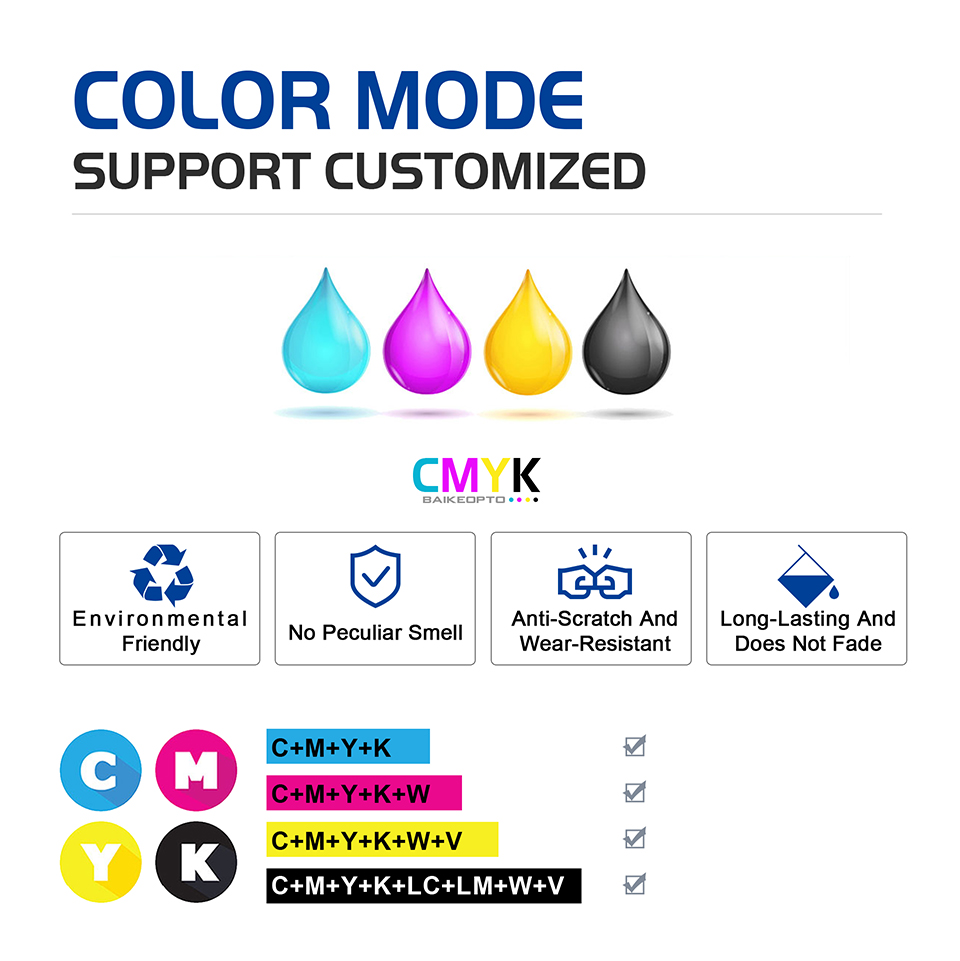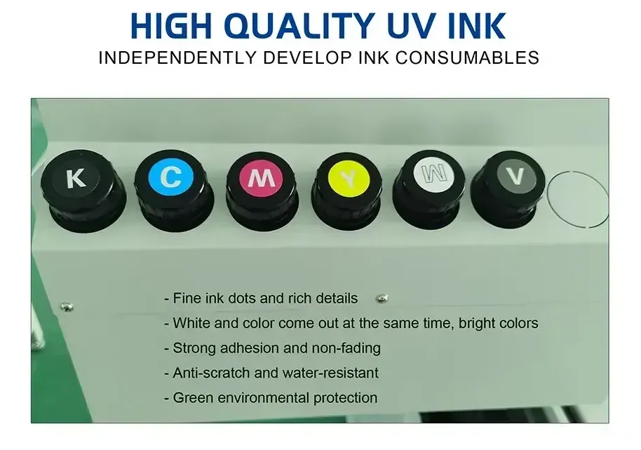 | 1. Four pcs High Precision Print Head, CMYKW UV ink 2.Waterproof,anti-corrosion,anti-scratch and anti-wear. 3.High resolution printing - provides excellent printing quality, making image details clearer and suitable for printing high demand graphics and photos. 4.Rapid curing technology - using LED UV curable ink to achieve a fast production process of instant printing and drying. 5.Environmental Protection and Energy Conservation - The low energy consumption operation process reduces environmental impact while lowering long-term operating costs. 6.Multi material compatibility - can print on various materials such as glass, metal, wood, plastic, etc. without the need for device replacement.Personalized 7.Customization capability - easily achieve personalized printing needs for small batches or a minimum order, meeting the customization market. 8.Accurate Color Management - The advanced color management system ensures that every printed color maintains consistency and accuracy. 9.White ink stacking function - can print three-dimensional and relief effects, increasing the added value and visual appeal of the product. 10. No plate making cost required - direct digital printing saves time and cost of plate making and proofing in traditional printing. |