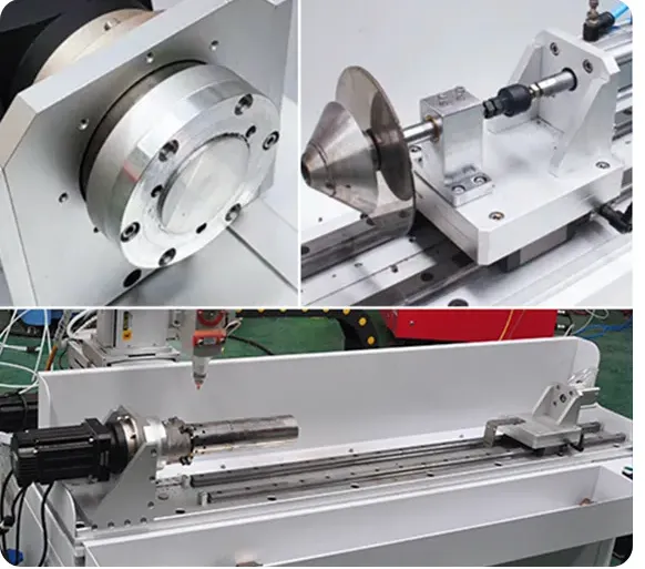 1. The pipe workpiece is equipped with three-jaw chuck and customized tooling to realize the rapid positioning and clamping of the workpiece with a diameter of 30-80mm. Equipped with portable thimble mechanism to achieve automatic and fast jacking of products of different lengths. Servo motor drives the tube to rotate.