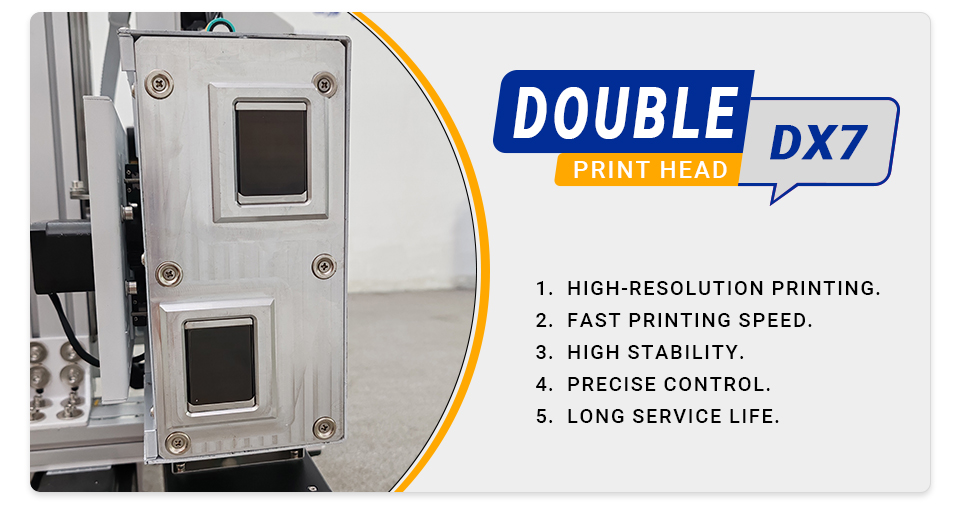 DOUBLE DX7 PRINT HEAD 1. HIGH-RESOLUTION PRINTING 2.FAST PRINTING SPEED. 3. HIGH STABILITY. 4.PRECISE CONTROL. 5. LONG SERVICE LIFE 6. WIDELY USED |