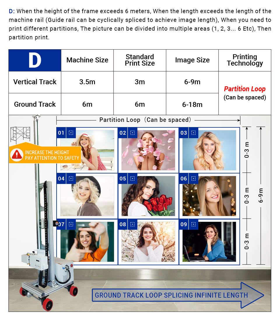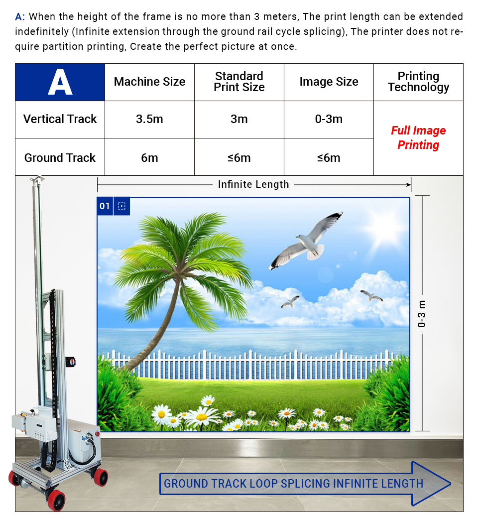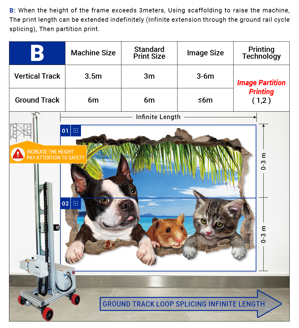 | A. When the height of the image is within 3 meters,the print length can be extended indefinitely(infinite extension through the ground rail cycle splicing), the printer does not require partition printing, create the perfect picture at once. | B. When you need to print images over 3 meters,using scaffolding to raise the machine, the print length can be extended indefinitely(infinite extension through the ground rail cycle splicing) , then partition print. |