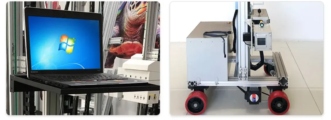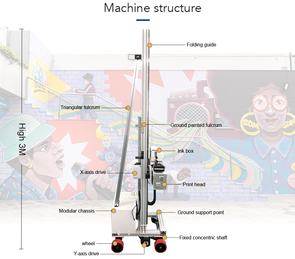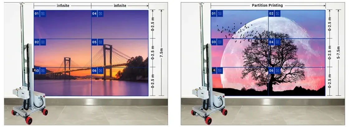 | A. When the height of the image is within 2.5 meters,No Partitioning required, one print done. | B. When you need to print images over 2.5 meters,the machine can to be raised by the scaffold for partition printing. |