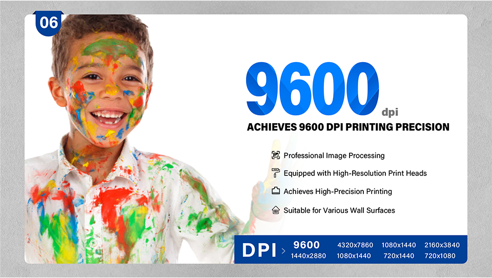 When printing, the Baike AI smart printer can intelligently recognize the white areasin the image, automatically skip the white areas, and seamlessly connect thenon-white areas for printing, this innovative technology can save ink, shorten printing time, and is suitable for printing on white walls.