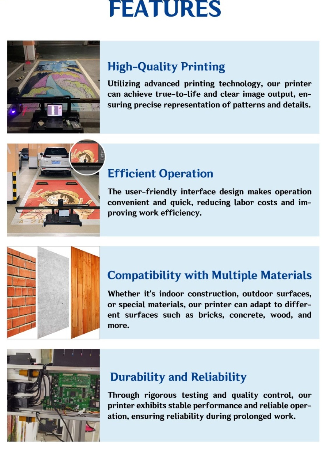 Q1: Are you a factory or a trading company? Q2: How long is the warranty period after purchasing the machine? Q3: How soon can the delivery be made after payment? Q4: How long can the printed patterns remain on the wall? Q5: How much ink is consumed for printing patterns? Q6: What should I do if I no longer want the printed pattern on the wall? Q7: What language settings are available on the machine? Q8: How do you handle uneven ground during printing? Q9. How is the quality of the machine? Are there any components that are prone to damage? Q10. Can one print head be used for printing four colors, while another print head is dedicated to printing white? |