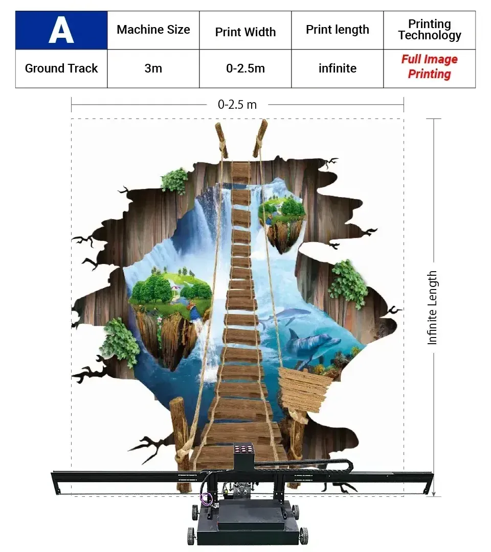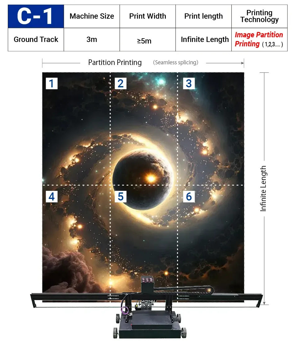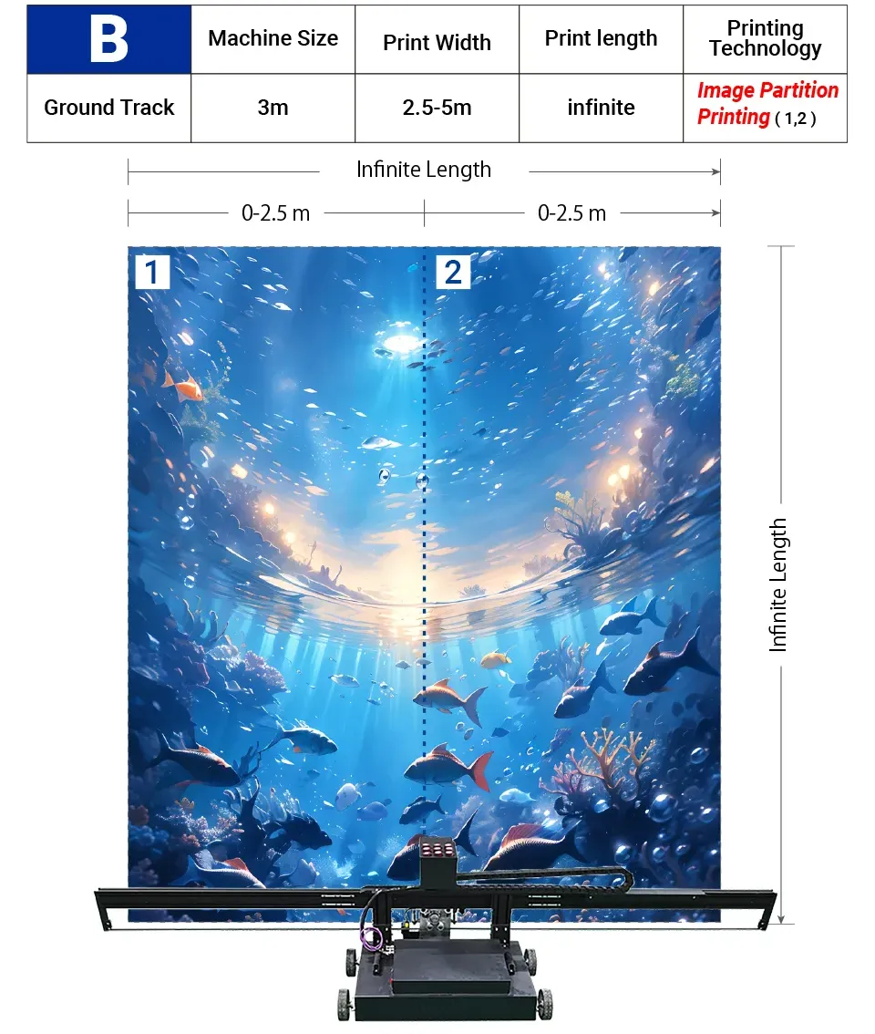| A. When the width of the image is within 2.5 meters,No Partitioning required, one print done. | B. When you need to print images over 2.5 meters,the picture need to divide into multiple areas for partition printing |