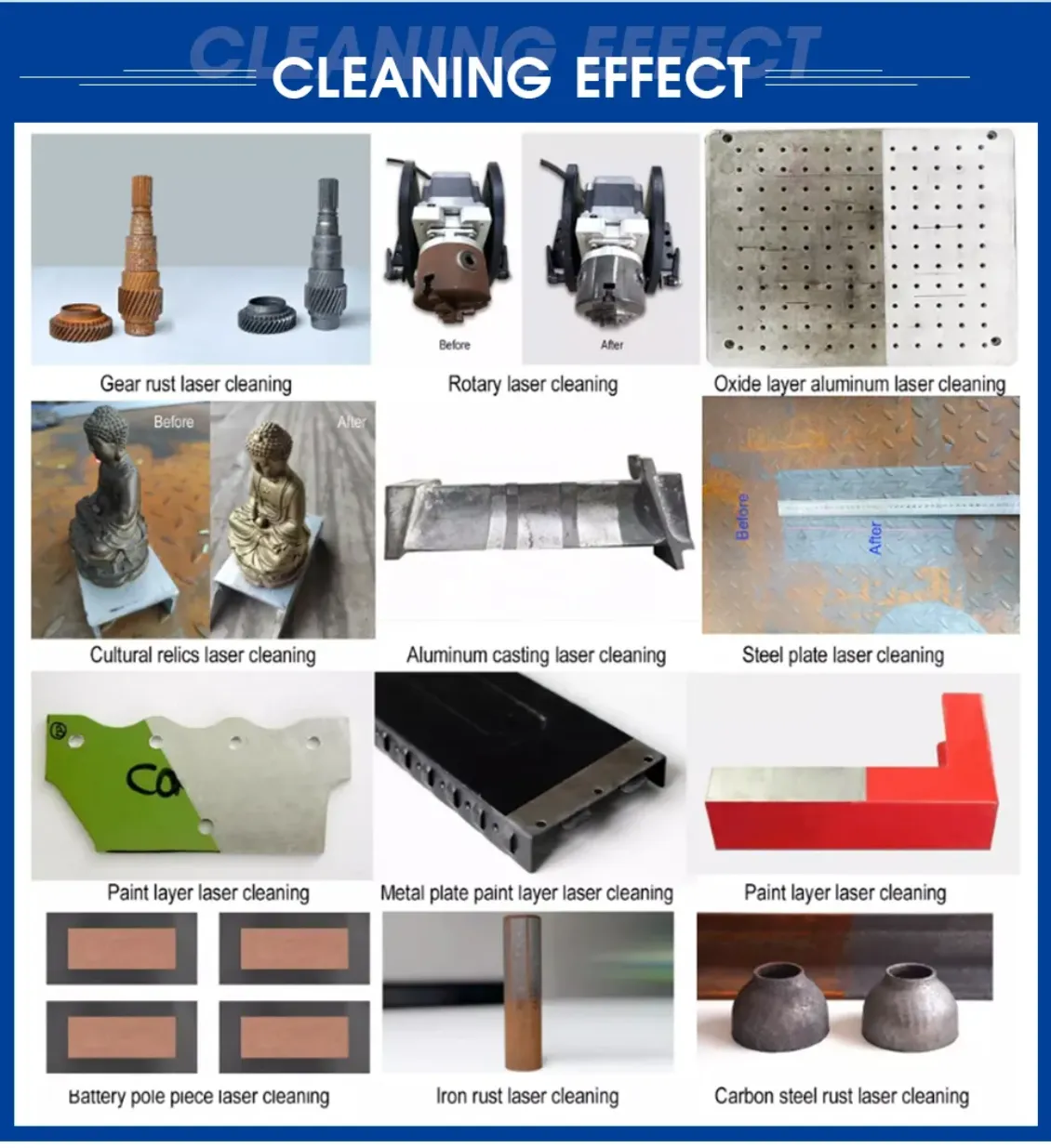 | Remove surface resin, paint, oil stains, dirt, rust, coatings, and oxidation layers from objects; this process is widely used in industries such as shipbuilding, auto repair, rubber molding, high-end machine tools, rail tracks, and environmental protection. |