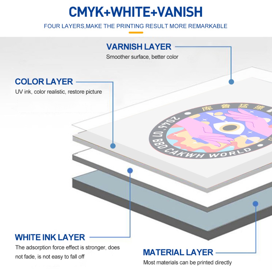 Glossy printing mode : Material Layer -most materials can be printed directly ; Embossed Layer- the adsorption force is stronger, does not fade, the relief strength is adjustable; Colour Layer- UV ink, Color realistic, restore picture; Varnish Layer- smoother surface, better color |