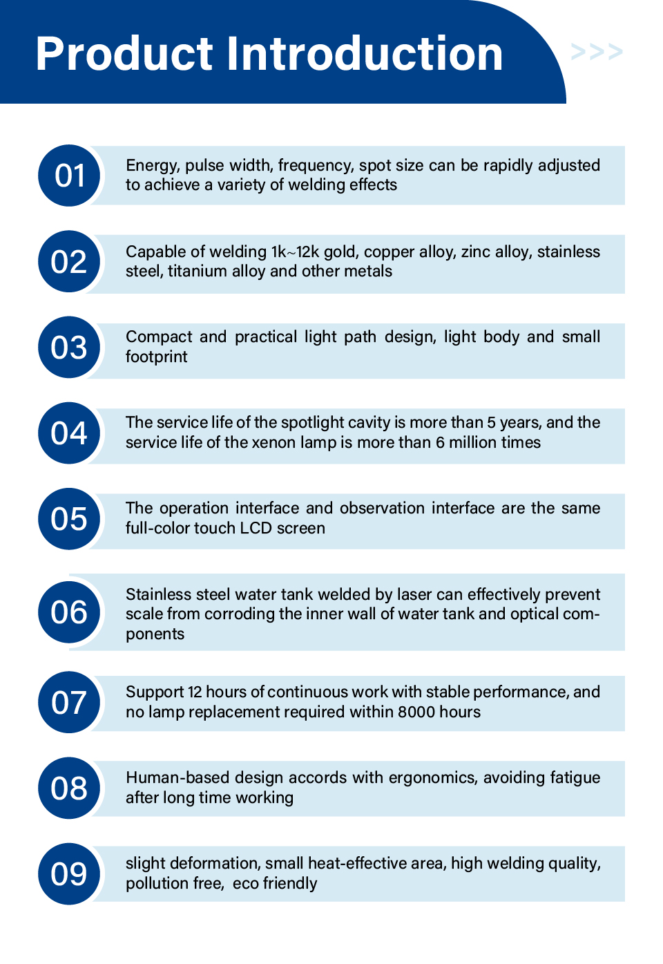 2.Adjustable parameters (such as energy, pulse width, frequency, spot diameter), can achieve different requirements of welding;