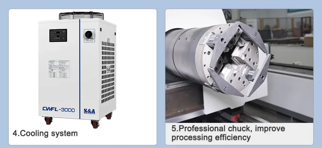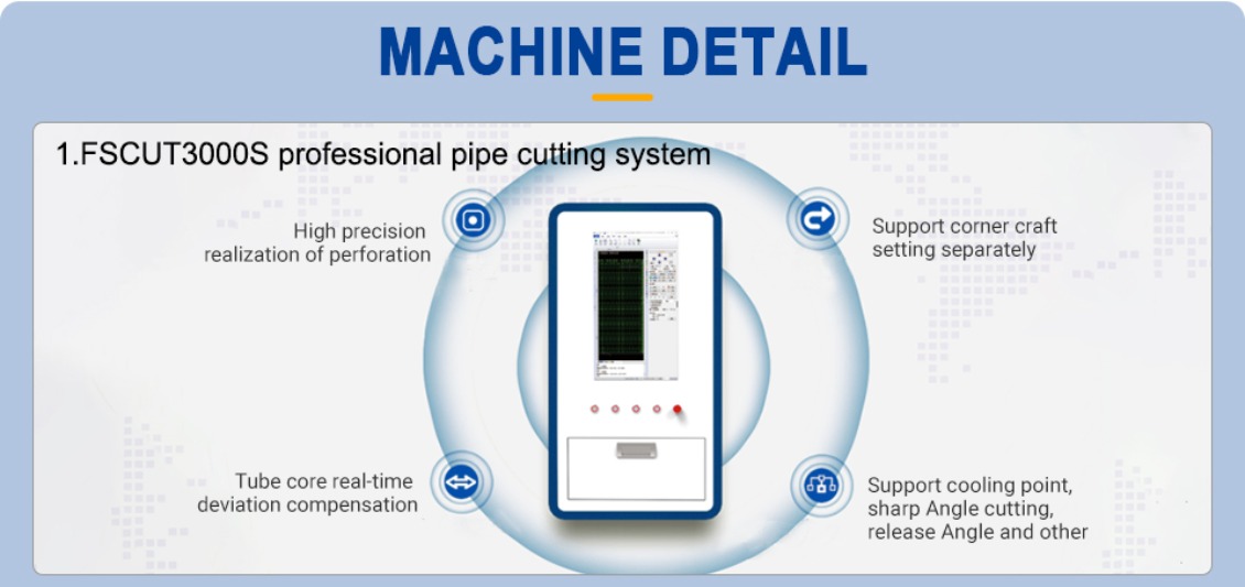 | 1. Side hanging plug type tube plate welded bed, triangular structure, higher stability of the bed, chuck center is located on the outside of the bed body, more convenient and reliable feeding, more effective to prevent cutting splashy iron slag falling on the rack and rail, increase the service life of equipment, more convenient daily maintenance. 2. movable front chuck, save tail design, tail shortest < 50mm; 3. Professional Bochu 3D pipe machine cutting system, can cut and process various types of pipes; 4. Cutting pipe diameter range: e 15-160mm round pipe, diagonal less than 160mm square pipe/special pipe; 5. Can match laser range: 1500-6000W. 6. The design of the surrounding shield is more beautiful and atmospheric. The operation area completely follows the ergonomic design, and the human-computer interaction is more convenient and comfortable. 7. The interior is surrounded by negative pressure design and is equipped with smoke dust collection device. The external dust blower can directly absorb the smoke generated in the cutting process, avoid the waste gas pollution of the workshop environment, and better protect the health and safety of the operators. |