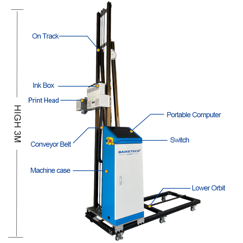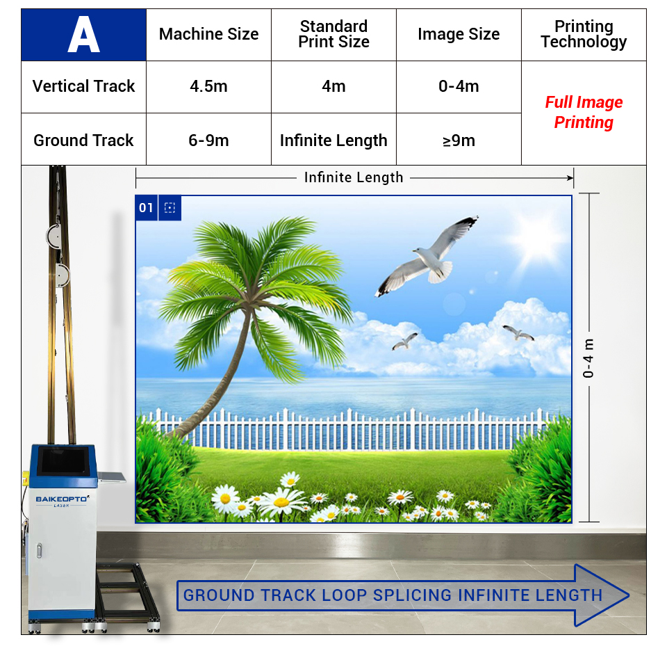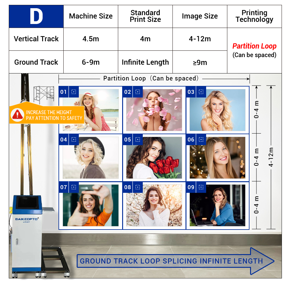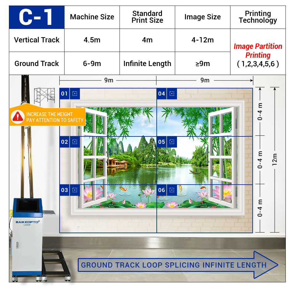 | A. When the height of the image is within 2.5 meters,No Partitioning required, one print done. | B. When you need to print images over 2.5 meters,the machine can to be raised by the scaffold for partition printing. |