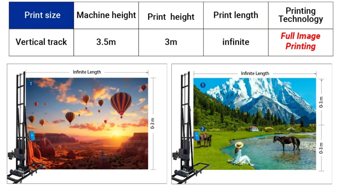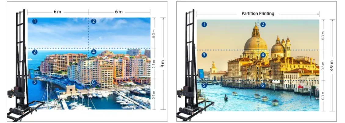 | A. When the height of the image is within 3 meters, the print length can be extended indefinitely(infinite extension through the ground rail cycle splicing), the printer does not require partition printing, create the perfect picture at once. | B. When you need to print images over 3 meters, you can use scaffolding to raise the machine, the print length can be extended indefinitely(infinite extension through the ground rail cycle splicing) , then do the partition printing. |