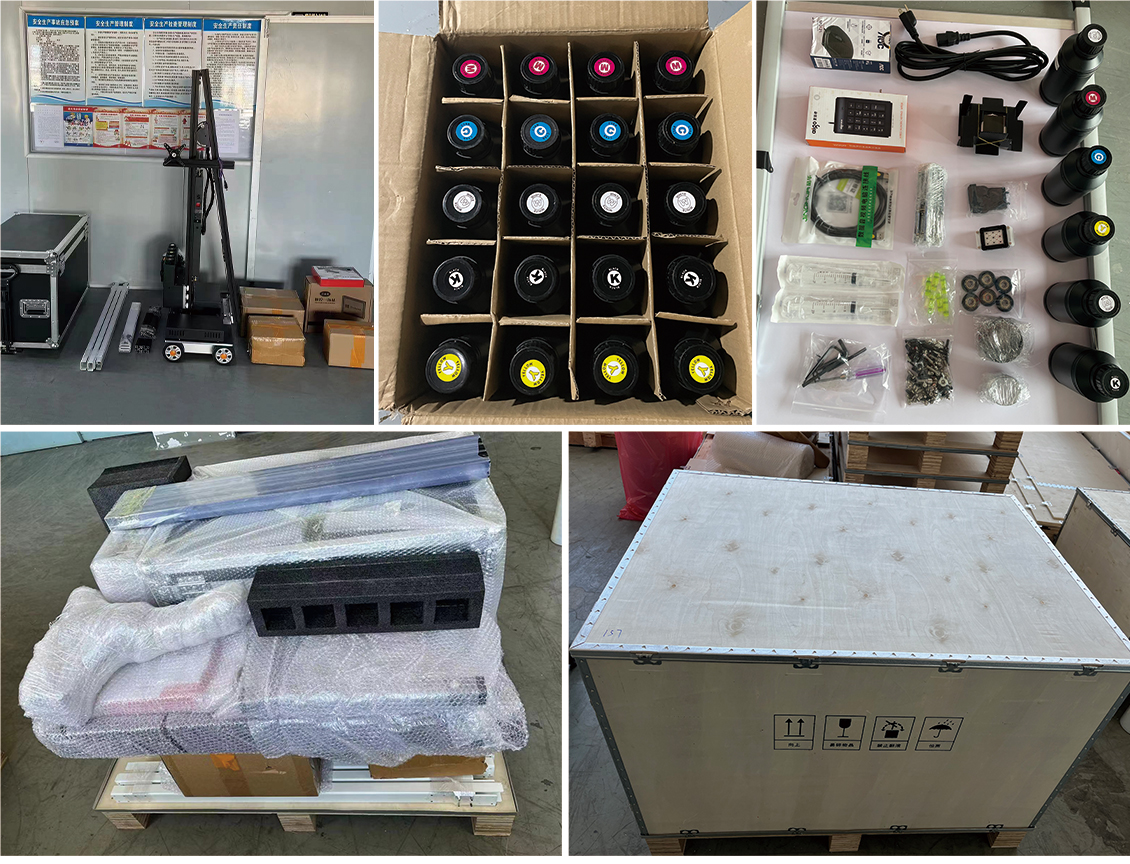 Q1: Are you a factory or a trading company? Q2: How long is the warranty period after purchasing the machine? Q3: How soon can the delivery be made after payment? Q4: How long can the printed patterns remain on the wall? Q5: How much ink is consumed for printing patterns? Q6: What should I do if I no longer want the printed pattern on the wall? Q7: What language settings are available on the machine? Q8: How do you handle uneven ground during printing? Q9. How is the quality of the machine? Are there any components that are prone to damage? Q10. Can one print head be used for printing four colors, while another print head is dedicated to printing white? |