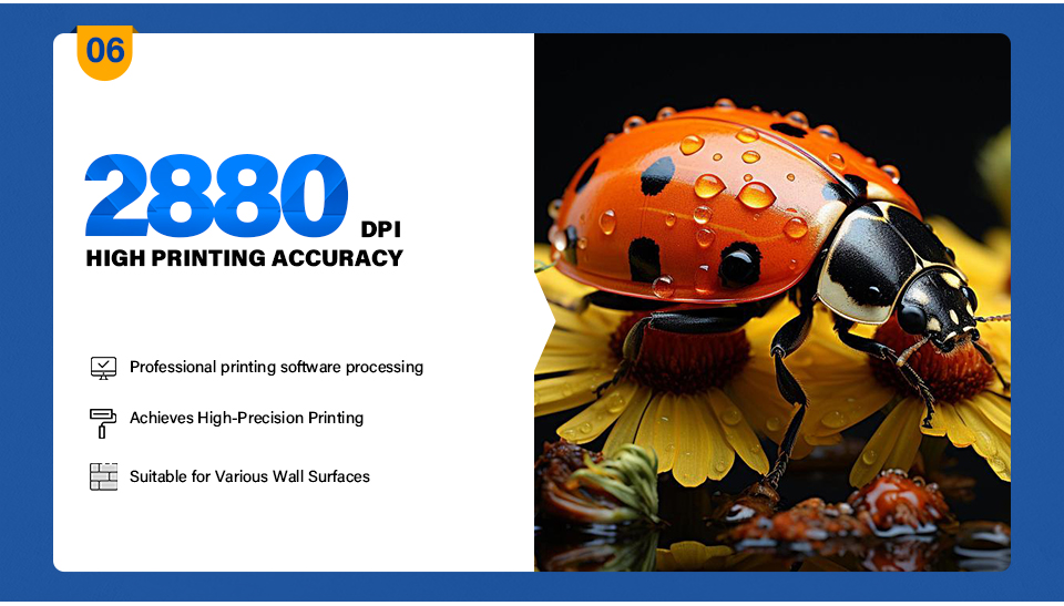 An inkjet wall printer is a large-scale digital printing device. lt is controlled by acomputer and can precisely spray or jet the designed patterns onto smooth vertical surfaces such as walls, glass, tiles, and wooden boards. It has expanded the traditional inkjet printing technology from paper to the interior surfaces of buildings, and it is a revolutionary technology in the fields of advertising printing, interior decoration and artistic creation. |