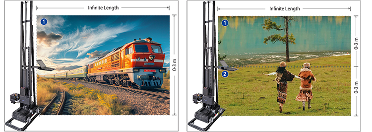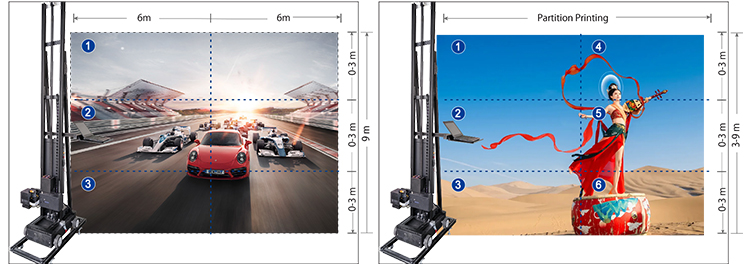 | A: When the height of the photo frame doesnot exceed 3 meters, the printing lengthcan be extended indefinitely, and the ma-chine does not need to partition printing,creating a perfect image at once. | B: When the height of the picture frame ismore than 3 meters, the printing length canbe extended indefinitely, and the machinecan be raised by scaffolding and then print-ed in partitions. |