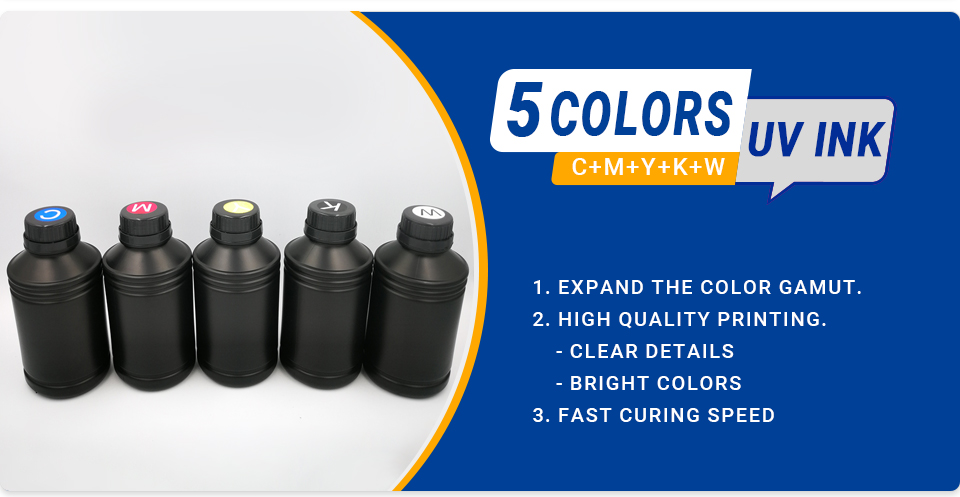 5 COLORS C+M+Y+K+W UV INK 1.EXPAND THE COLOR GAMUT. 2.HIGH QUALITY PRINTING, -CLEAR DETAILS -BRIGHT COLORS 3.FAST CURING SPEED 4.OUTDOORS 10 YEARS UNFADING. 5.INDOOR 15 YEARS UNFADING. |