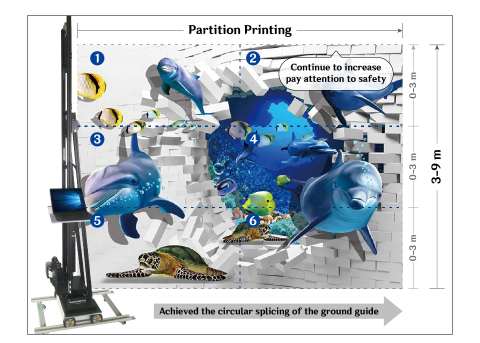 | C. When the height of the frame exceeds 3 meters , when the length does not exceed the length of the machine guide rail (fixed image size), the picture can be divided into multiple areas(1,2,3....6 etc.) ,then partition print. | D. When the height of the frame exceed 6 meters , when the length exceeds the length of machine rail(guide rail can be cyclically spliced to achieve image length), When you need to print different partitions, the picture can be divided into multiple areas(1,2,3...6 etc.), then partition print. |