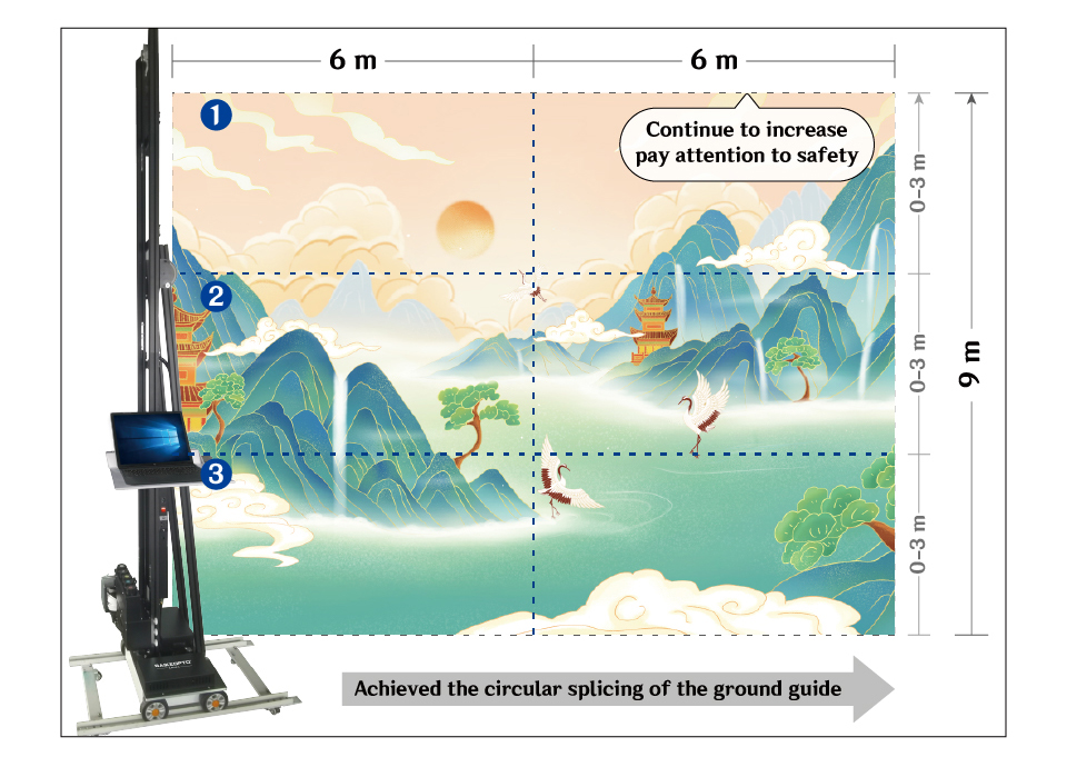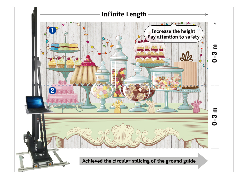 | A. When the height of the image is within 3 meters,the print length can be extended indefinitely(infinite extension through the ground rail cycle splicing), the printer does not require partition printing, create the perfect picture at once. | B. When you need to print images over 3 meters,using scaffolding to raise the machine, the print length can be extended indefinitely(infinite extension through the ground rail cycle splicing) , then partition print. |