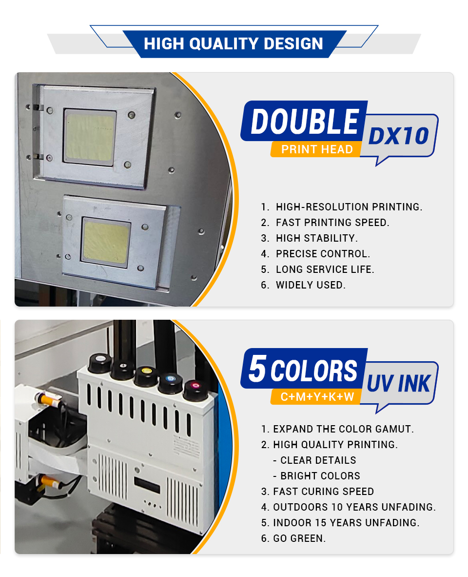 1.Two pcs DX10 Print Head, CMYKW UV ink, UV lamp
