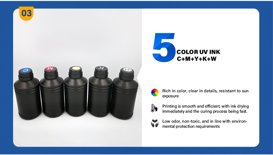 UV Ink -Cyan, Magenta, Yellow, Black, White can be mixed up to create any color -High light fastness, waterproofness, and abrasion resistance. -Indoors: 5 years. Outdoors: 10 years. -Quick-dry in just minutes with UV lamp, no need much waiting time
