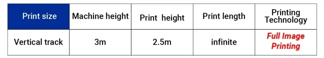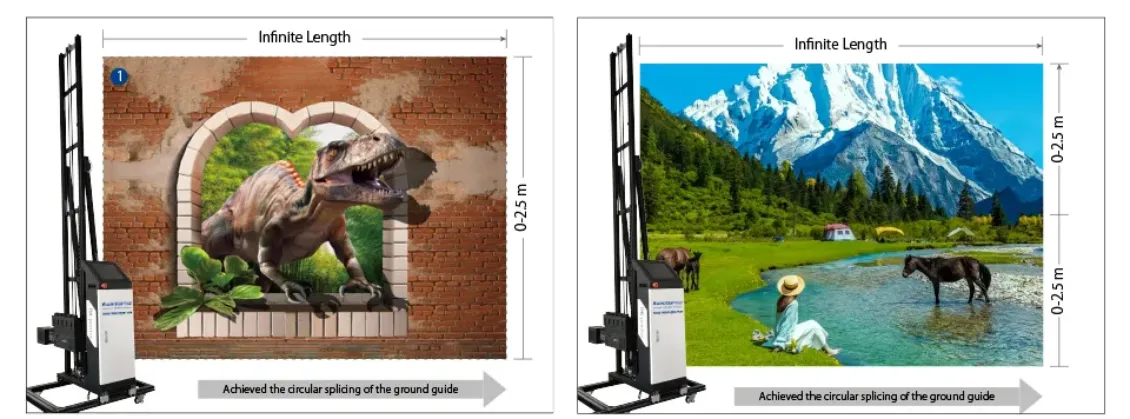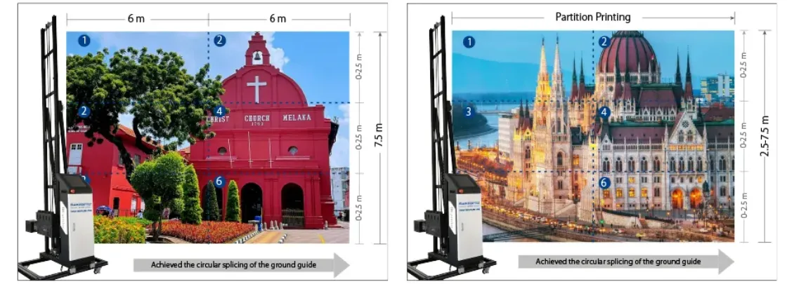 | A. When the height of the image is within 2.5 meters,the print length can be extended indefinitely(infinite extension through the ground rail cycle splicing), the printer does not require partition printing, create the perfect picture at once. | B. When you need to print images over 2.5 meters,using scaffolding to raise the machine, the print length can be extended indefinitely(infinite extension through the ground rail cycle splicing) , then partition print. |