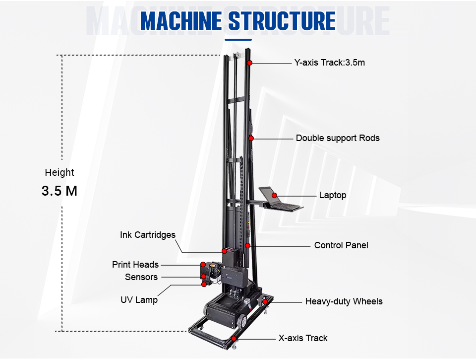 | A. When the height of the image is within 3 meters, the print length can be extended indefinitely(infinite extension through the ground rail cycle splicing), the printer does not require partition printing, create the perfect picture at once. | B. When you need to print images over 3 meters, you can use scaffolding to raise the machine, the print length can be extended indefinitely(infinite extension through the ground rail cycle splicing) , then do the partition printing. |