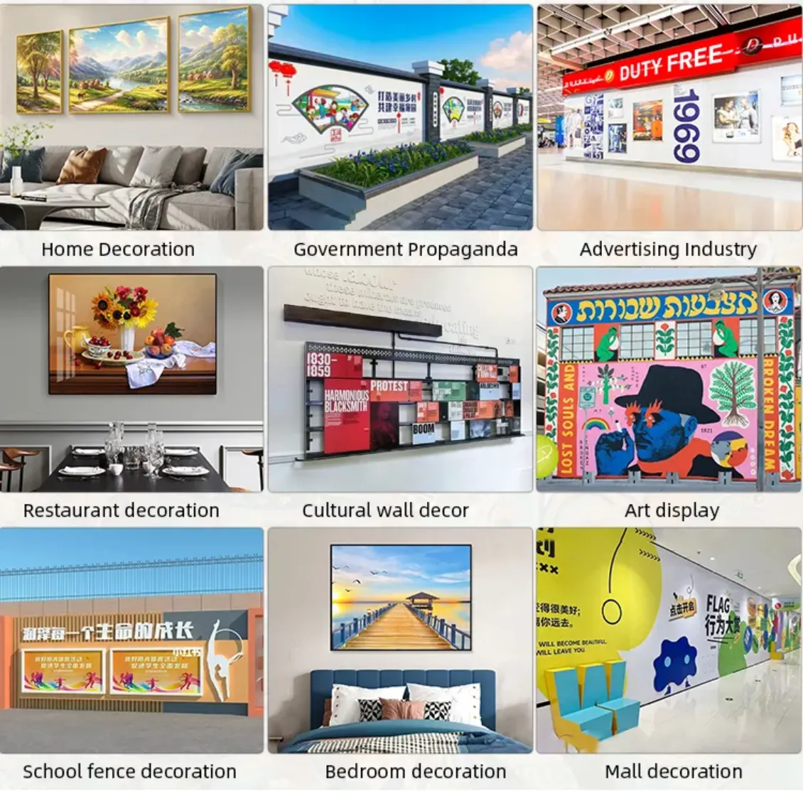 | Applicable industries The wall printer has a great role for indoor and outdoor decarations. lt'snot only perfect for commercial advertising career, but also is importantfor personal decoration needs, such as street graffiti, TV background walldecor, mall decoration,hotel decoration, school fence decor, cultural walldecor,advertising wall and truck decorations. |