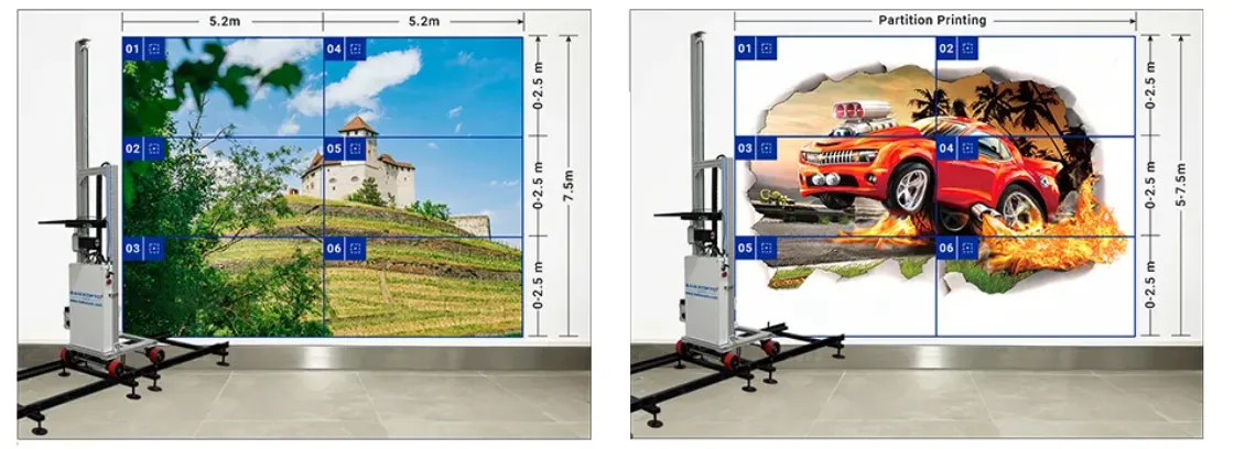 | A. When the height of the image is within 2.5 meters,No Partitioning required, one print done. | B. When you need to print images over 2.5 meters,the machine can to be raised by the scaffold for partition printing. |
