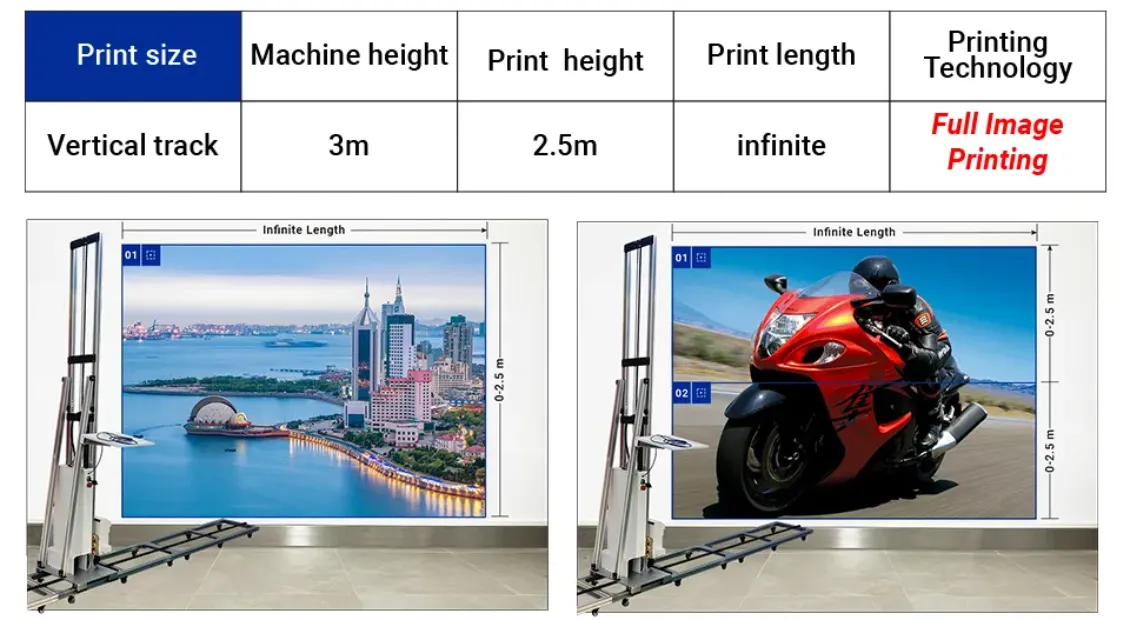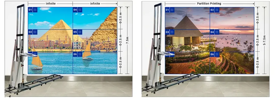 | A. When the height of the image is within 2.5 meters,No Partitioning required, one print done. | B. When you need to print images over 2.5 meters,the machine can to be raised by the scaffold for partition printing. |