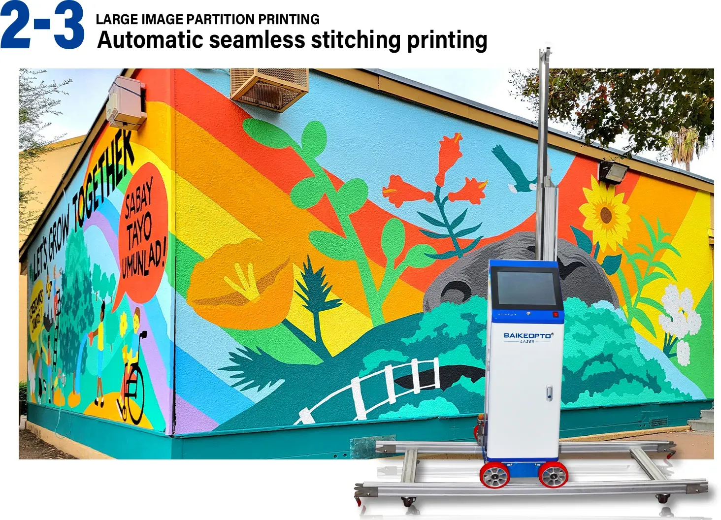 When the image height exceeds 2 meters and the length can be extended indefinitely, and partitioned printing is necessary, the image can be divided into N zones(1,2,3......8,etc.)The Baike intelligent Printer can sutomatically seamlessly stitch the N zones together, achieving an automated, efficient, and complete printing result. *Note: When printing large images, you can use a scaffold to lift the printer. Please pay attention to safety and take safety precautions |
