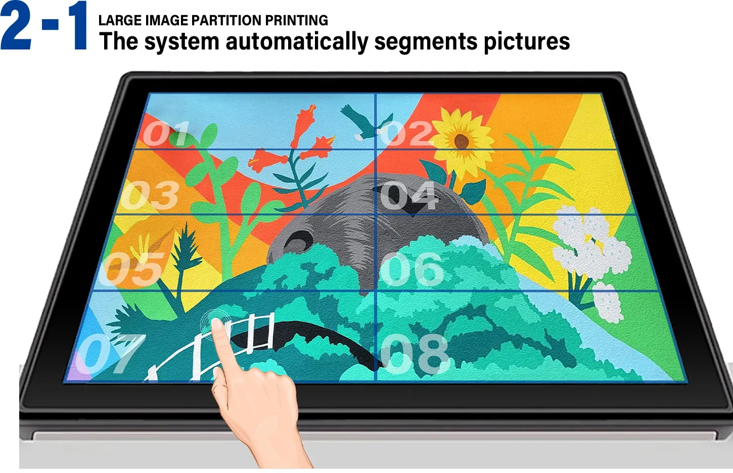 When the image height is more than 2 meters and the length can be extended indefinitely, the Baike AI Intelligent Printer can automatically segments pictures into N small images for printing. During Printing, the N small images can be automatically seamlessly connected to form a complete large image. |