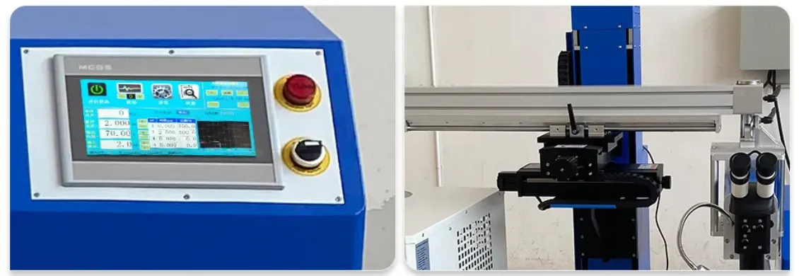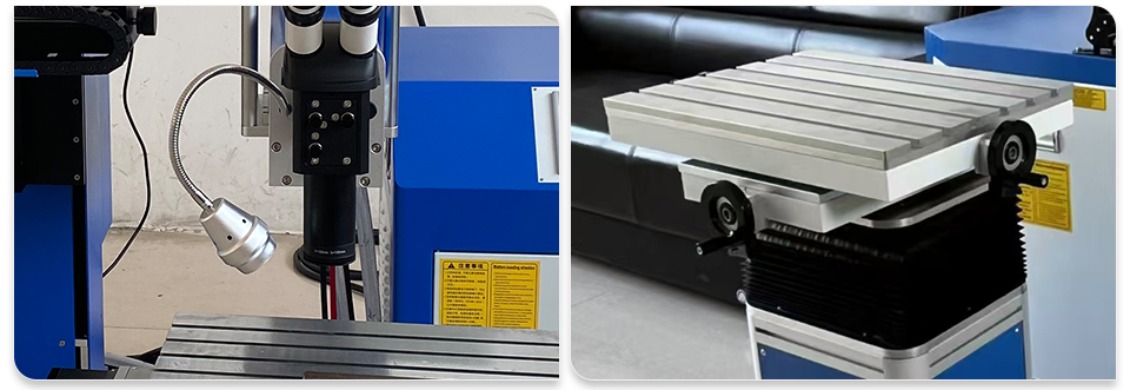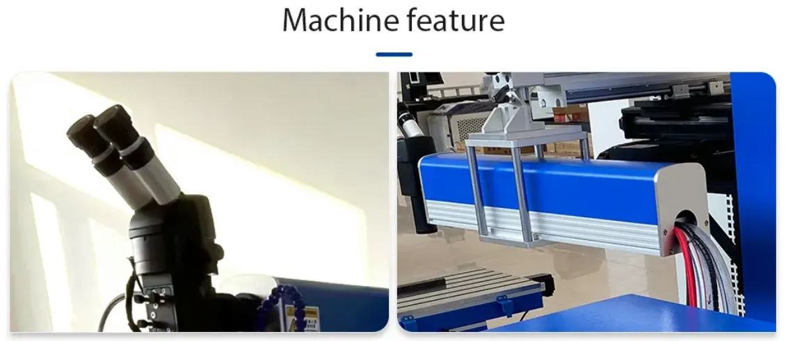 4. This type of welding machine is equipped with a cross-cursor stereoscopic micro-scope, magnifying the welding position by 10 times. The center of the cross cursorover laps with the center of the laser spot, making it easy to position.
