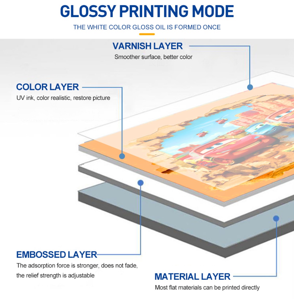 Glossy printing mode : Material Layer -most flat materials can be printed directly ; Embossed Layer- the adsorption force is stronger, does not fade, the relief strength is adjustable; Colour Layer- UV ink, Color realistic, restore picture; Varnish Layer- smoother surface, better color |