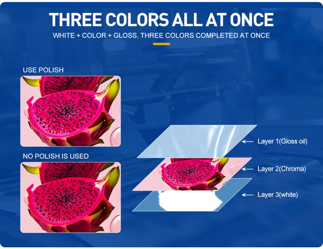 | Three colors all at once: white+color+ varnish oil, three colors completed at once |