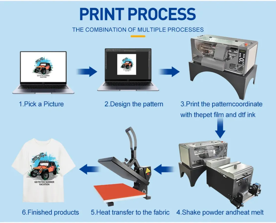 | Printing Process: 1. Choose a picture , 2. Design the pattern, 3. Print the pattern coordinate with the pet film and DTF ink , 4. Shake powder and heat melt ,5. Heat transfer to the fabric 6. Finished Products |